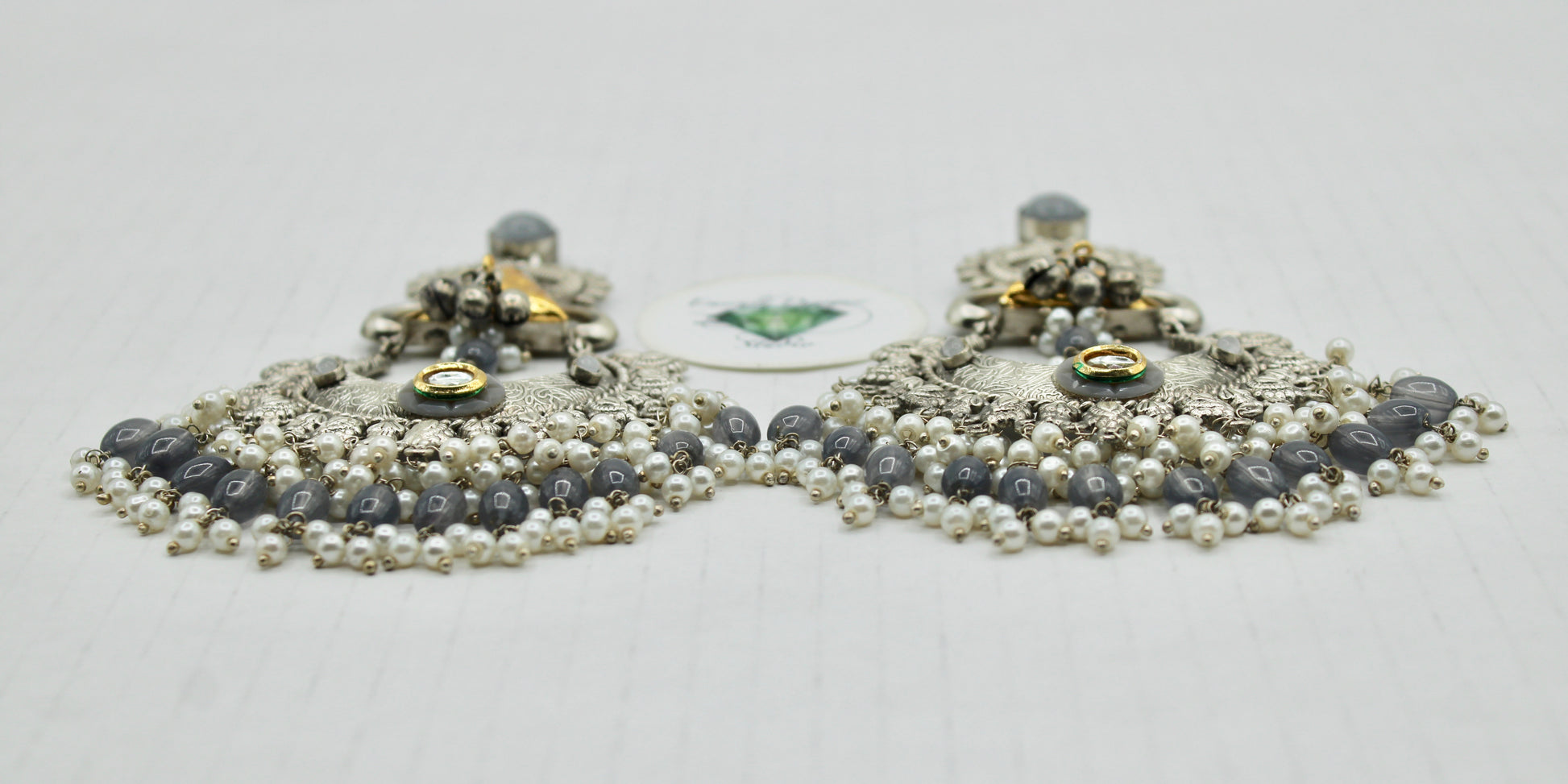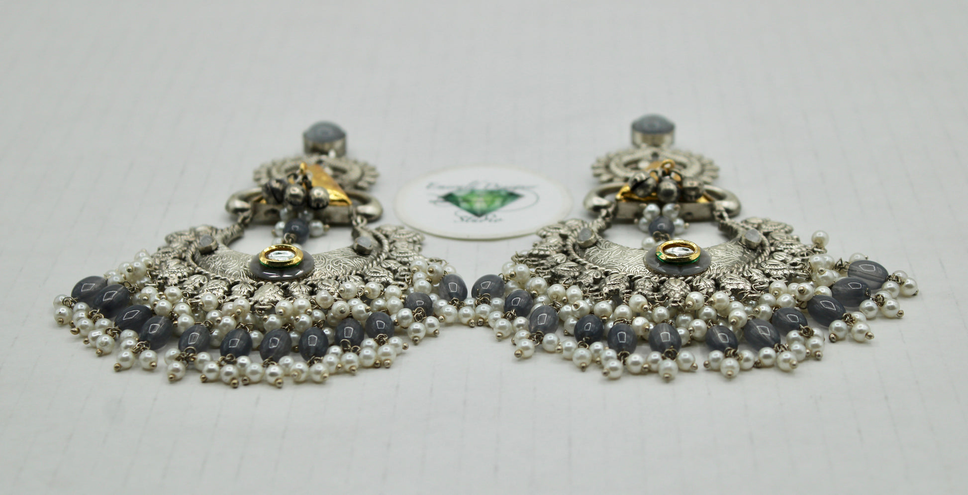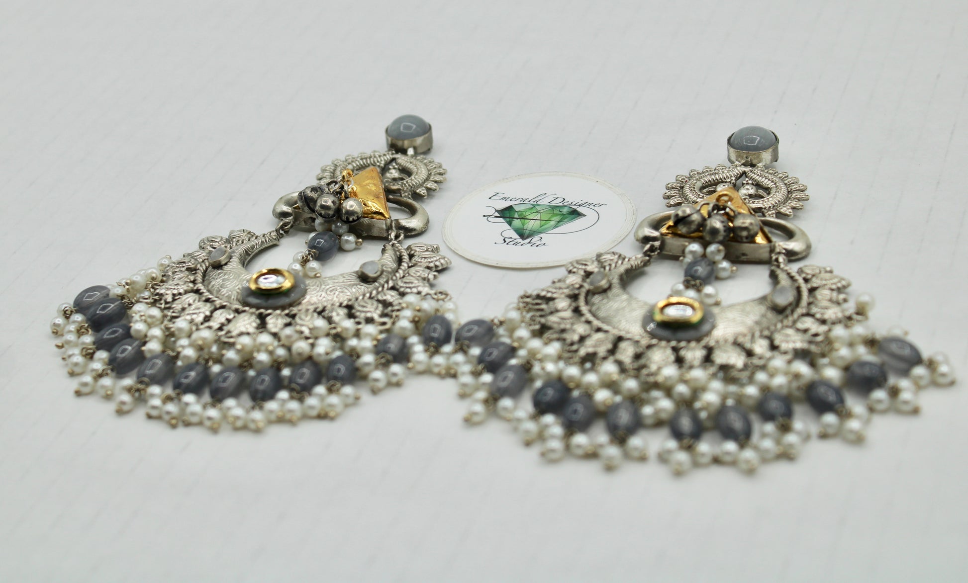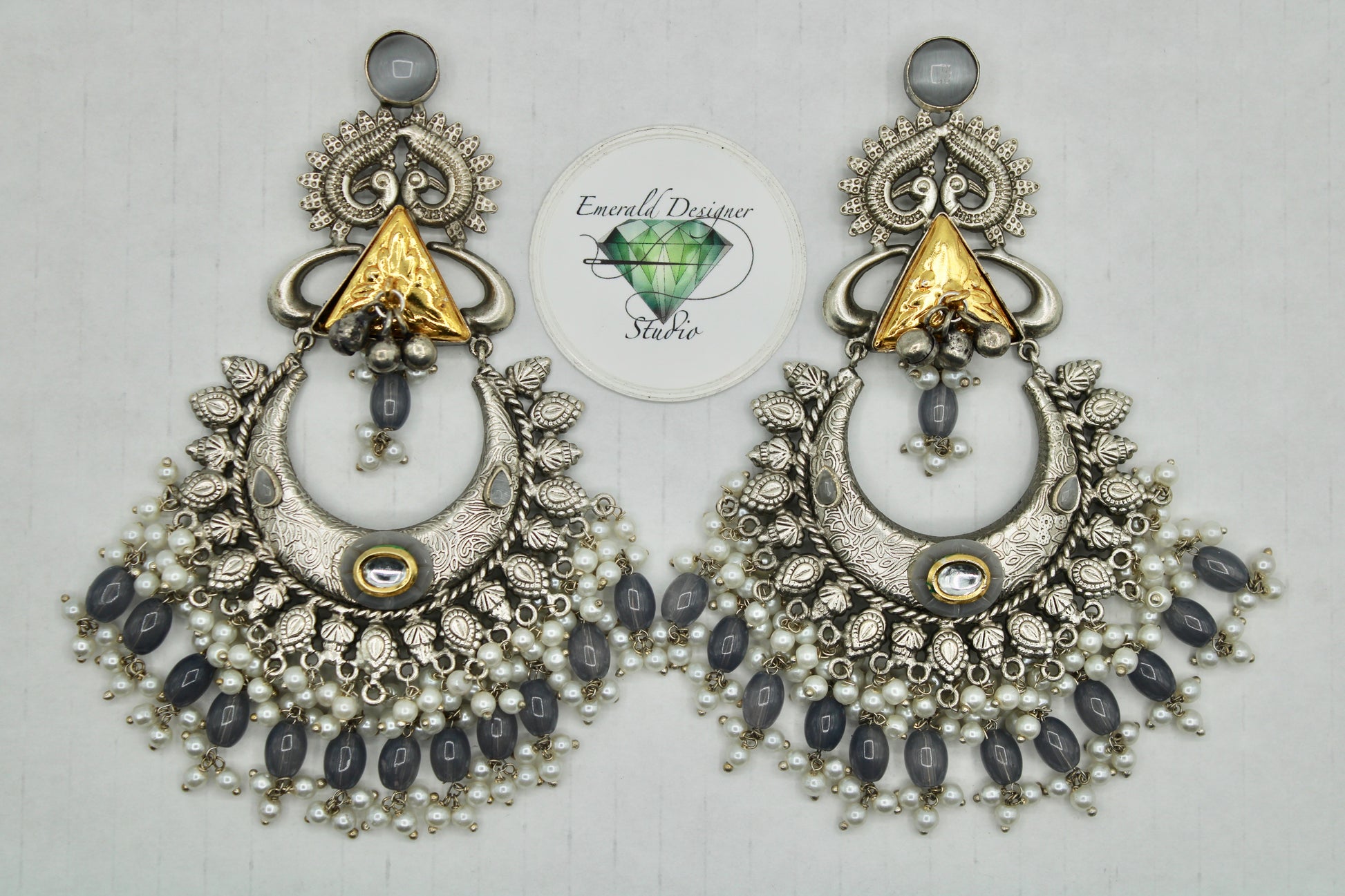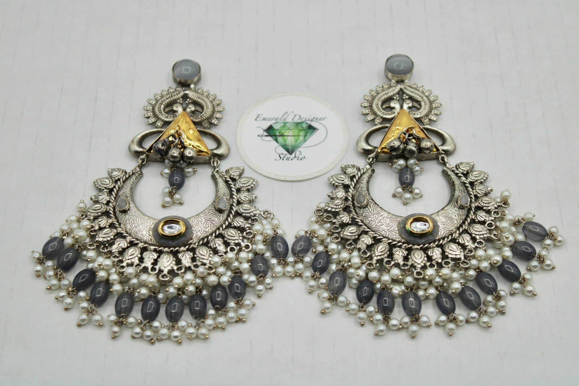 These oxidized earrings are complete with monalisa, kundan, beads and faux pearl. These dazzling earrings are sure to elevate any look.