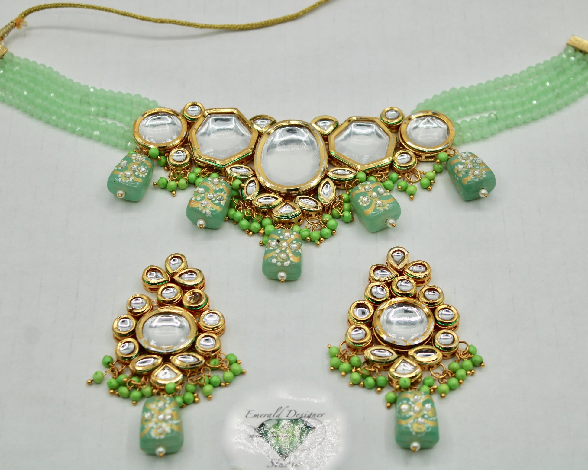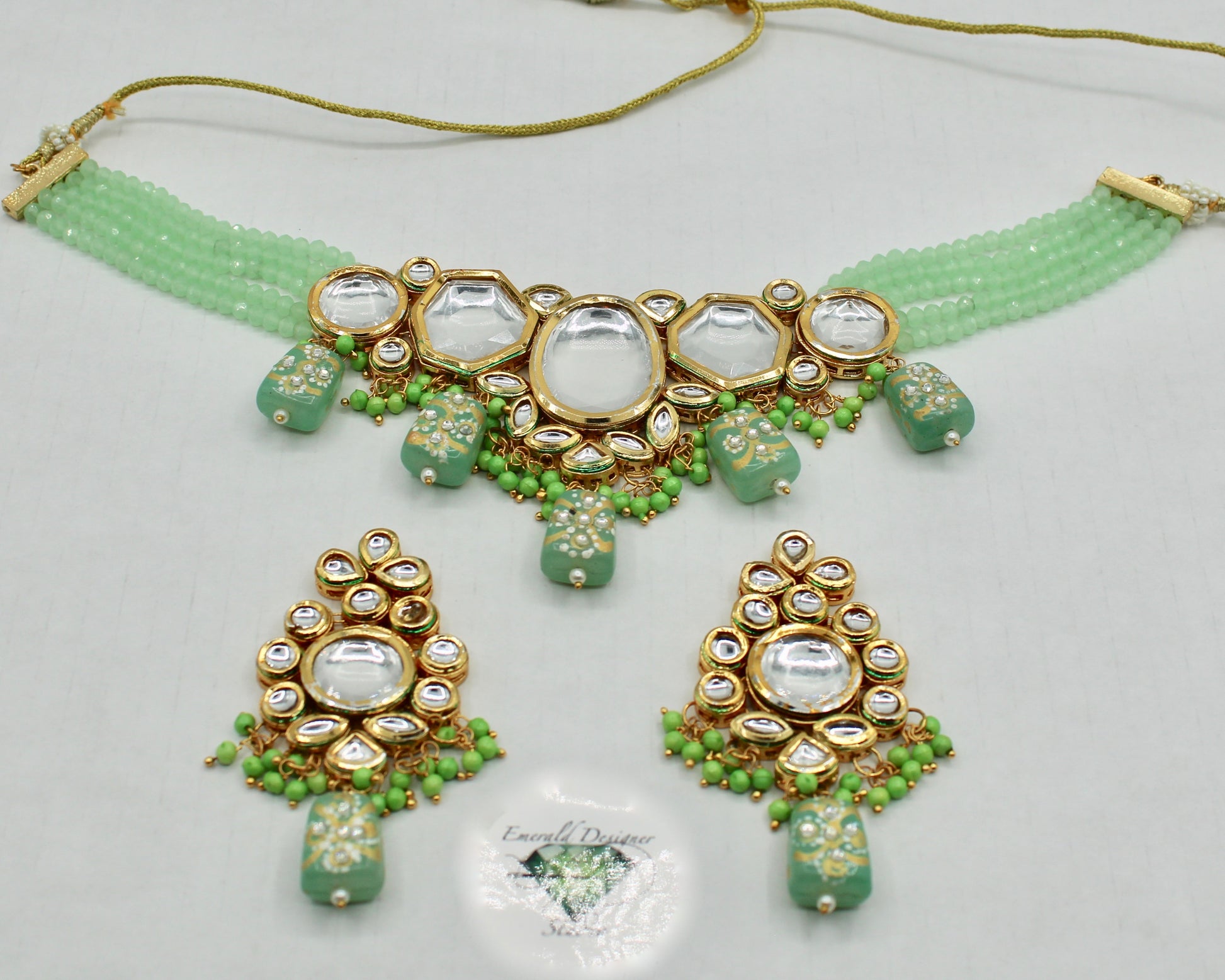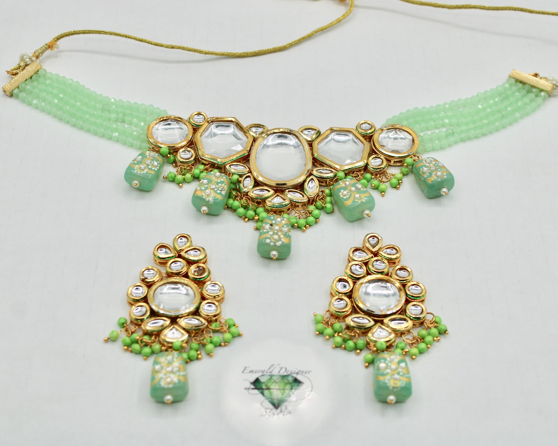 یہ ہاتھ سے بنا ہوا کندن ہار سیٹ ایک شاندار ہار اور بالیاں کے ساتھ آتا ہے۔ یہ موتیوں اور ہاتھ سے تیار کردہ موتیوں کے ساتھ تفصیلی ہے، جس کی پشت پر مینا کاری کے ساتھ ختم کیا گیا ہے۔ مصنوعات کی زندگی بھر میں اضافہ کرنے کے لیے پیتل سے بنا ہے۔