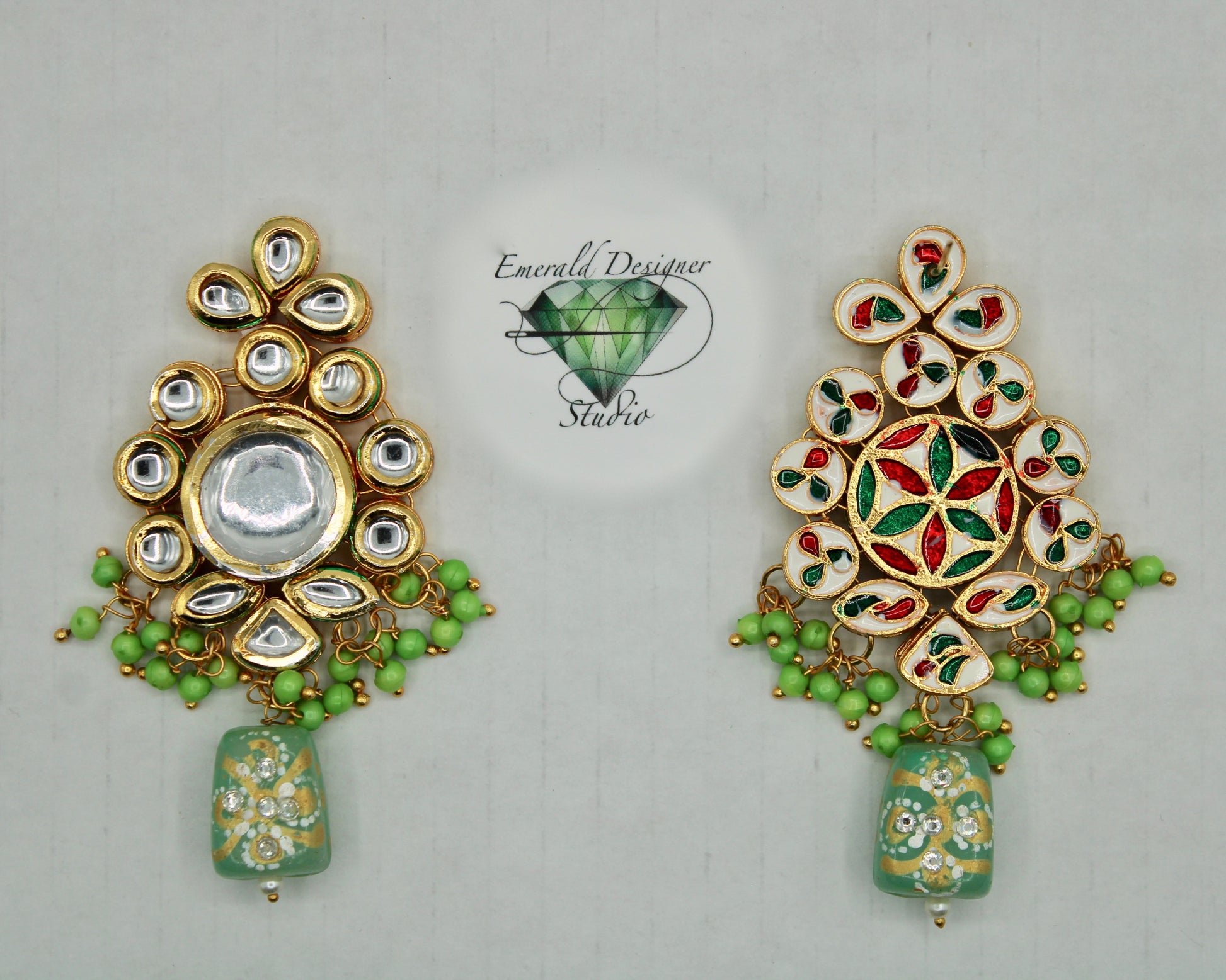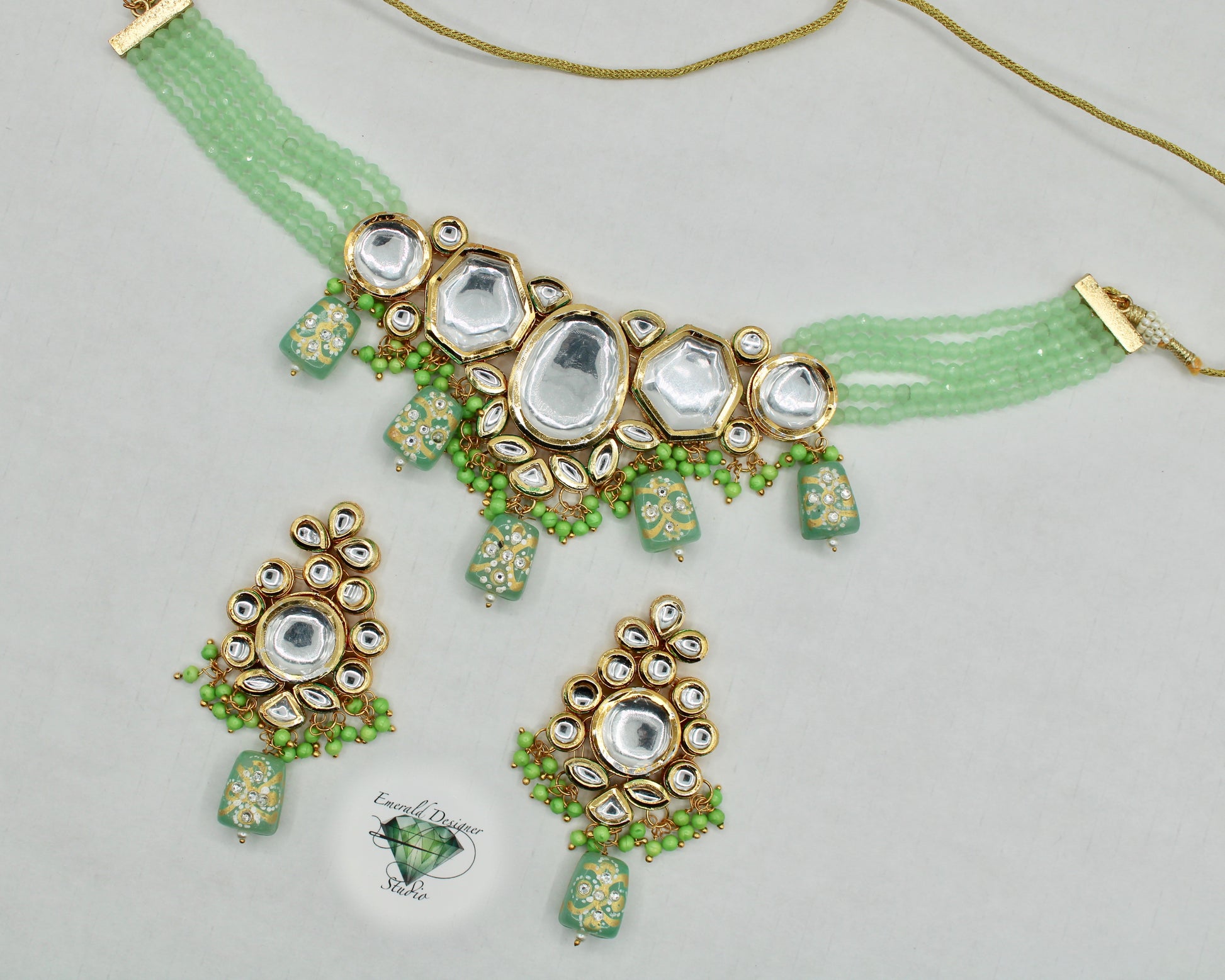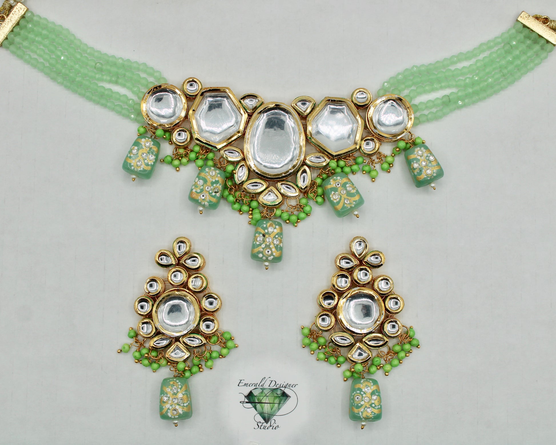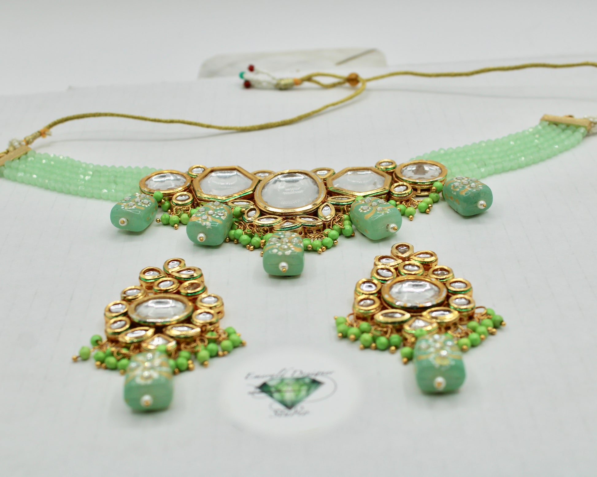 یہ ہاتھ سے بنا ہوا کندن ہار سیٹ ایک شاندار ہار اور بالیاں کے ساتھ آتا ہے۔ یہ موتیوں اور ہاتھ سے تیار کردہ موتیوں کے ساتھ تفصیلی ہے، جس کی پشت پر مینا کاری کے ساتھ ختم کیا گیا ہے۔ مصنوعات کی زندگی بھر میں اضافہ کرنے کے لیے پیتل سے بنا ہے۔